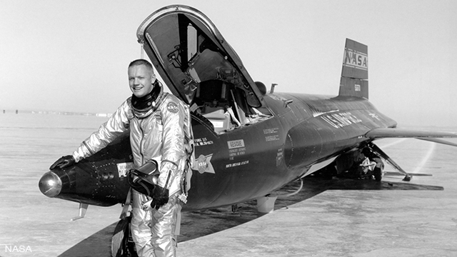 Sur cette photo, ce jeune homme qui sourit devant l’avion-fusée X-15 est un pilote d’essai de la NASA. Il deviendra quelques années plus tard une star mondialement connue.